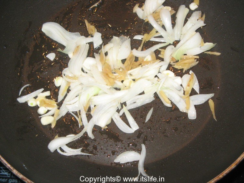 In a pan, add Olive Oil, Garlic, Spring Onions, and Ginger and sauté.