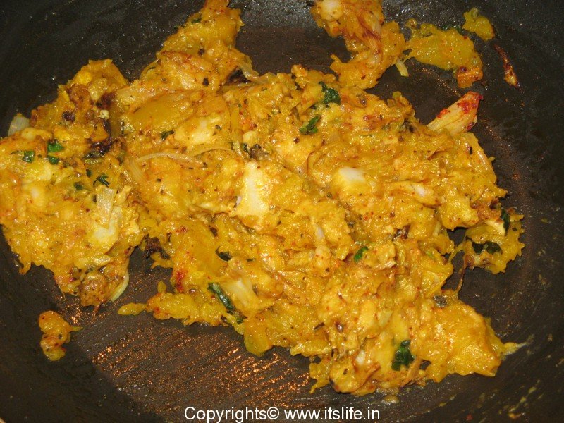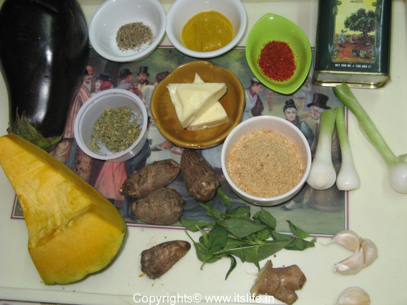 Add Pumpkin and Colacassia, Chili powder, mixed herbs, and Mustard paste. Add Salt and black Pepper. Remove to a bowl and cool.