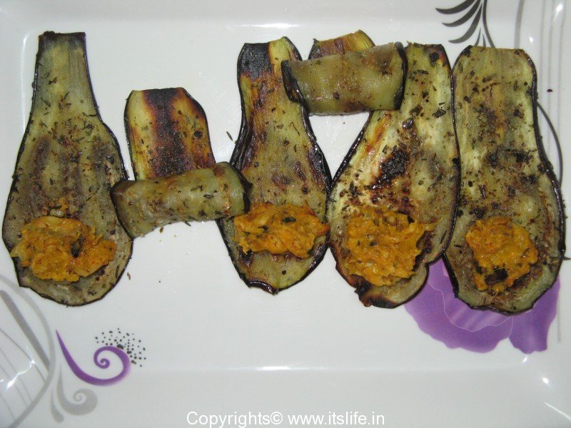 On each of the grilled Eggplant slices, add a tablespoon of the filling and roll them.