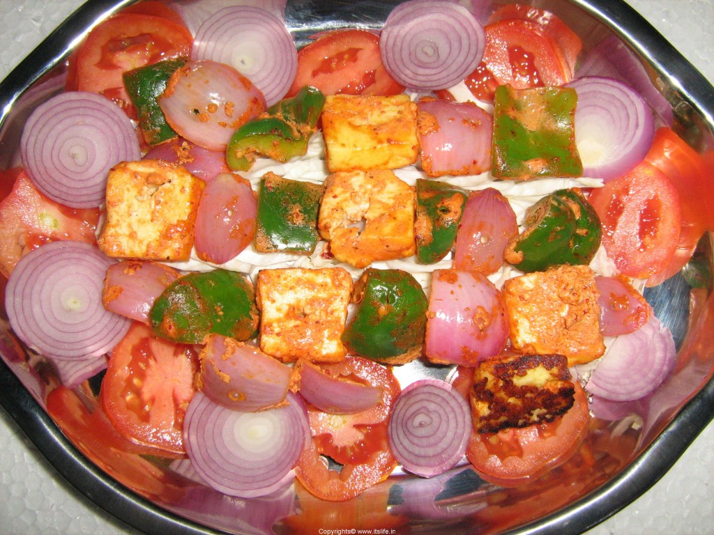 Mix all the ingredients for the marinade well. Take the prepared pieces of paneer and vegetables and mix well with marinade. Keep aside for about two hours.