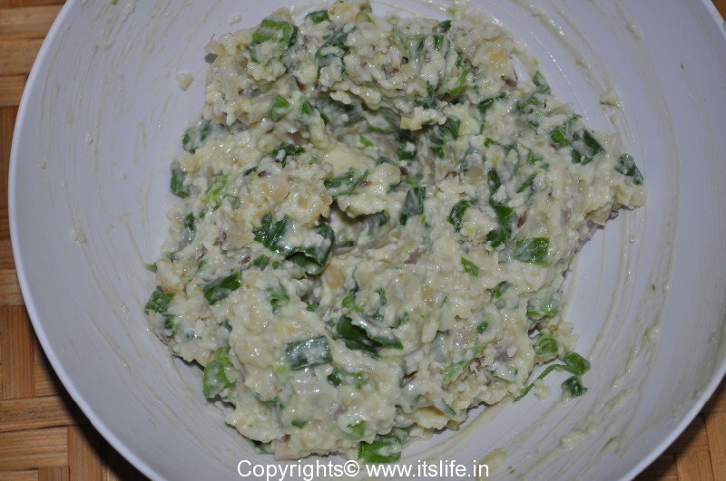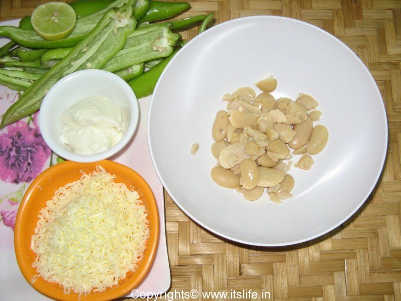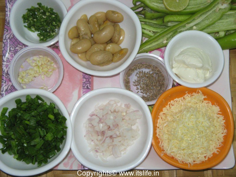 In a mixing bowl, mash Boiled Double Beans, to this add half cup of Cheese, Cream Cheese, Cumin-Onion-Garlic, Salt, Spring Onions, and Green Chilies or Cayenne Powder. Mix well.