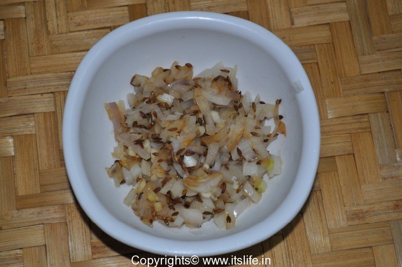 Heat Oil and add Cumin Seeds, Garlic, and Onion and saute for a minute.