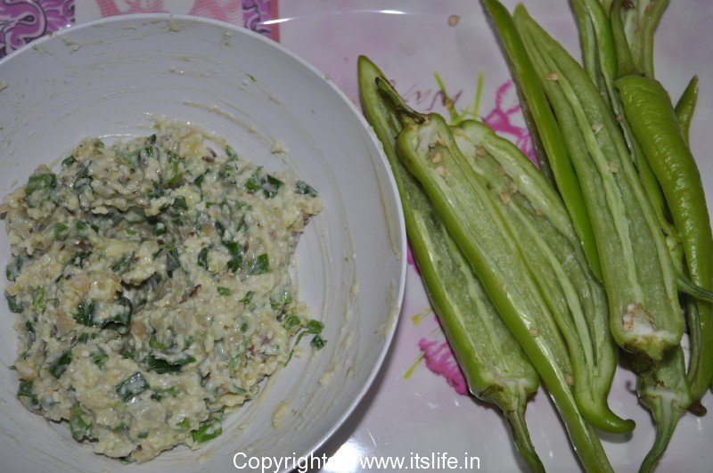 Cut each Jalapeno / Shimla mirch vertically in half. Scoop out the seeds.