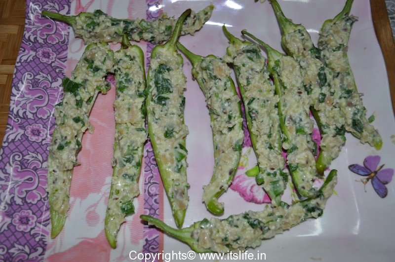 Stuff each Jalapeno or Shimla Mirch with the Cream-Cheese filling and keep it aside.