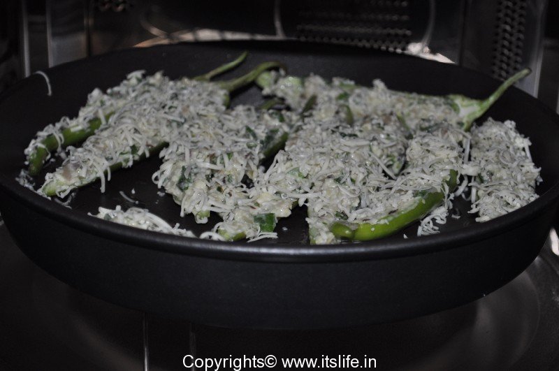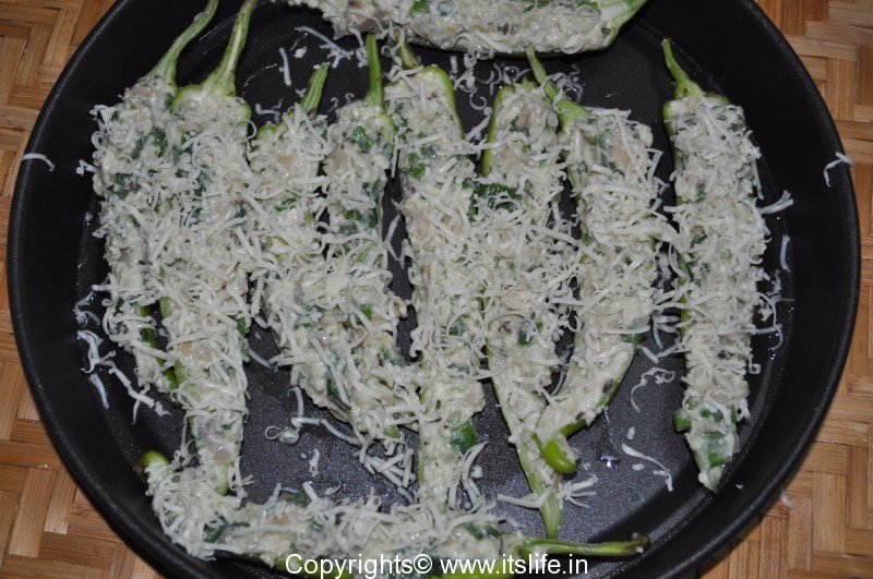 Onto a greased baked tray, place the stuffed Jalapenos, stuffed side up.