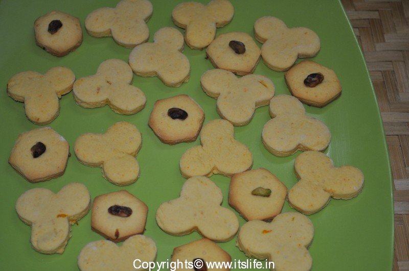 Cream Butter in a mixing bowl. Add Maida, Custard Powder, Corn flour, Sugar one-by-one and mix well. Add Curd, Vanilla Essence, Orange Zest, and Orange juice and mix well to form a dough.