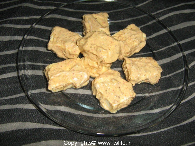 Mix Hung Curds, Coriander, Chili, Saunf, Aachur, Turmeric, Salt, and Besan in a mixing bowl. Coat the Paneer cubes with the mixture. Leave it aside for 10 Minutes. Heat a pan and add Oil and shallow fry the Paneer on both sides or skewer the pieces and grill in an oven until done.