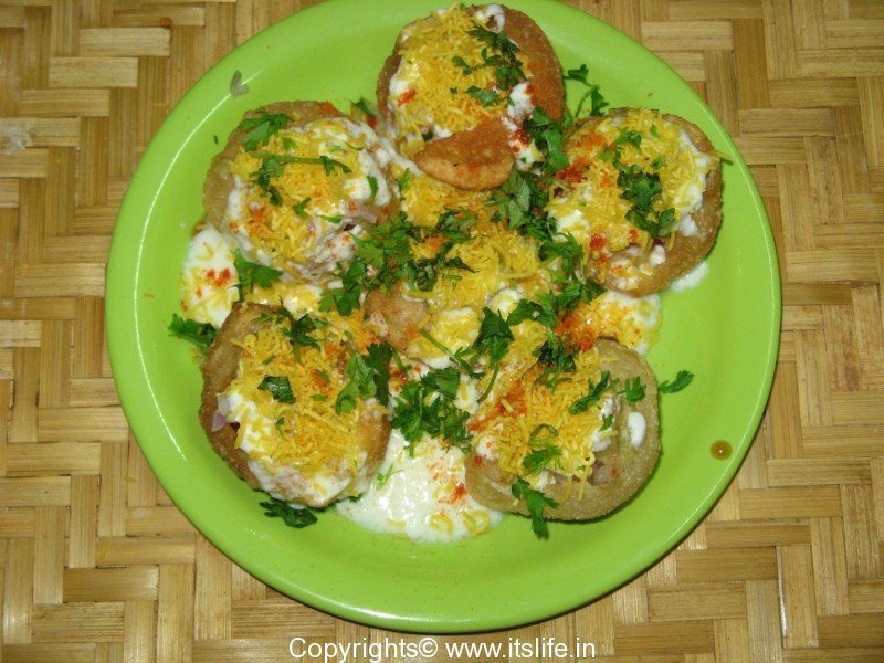 Aloo Sev Dahi Puri is a sweet and tangy snack prepared using Potatoes, Yoghurt and flat round crisps.