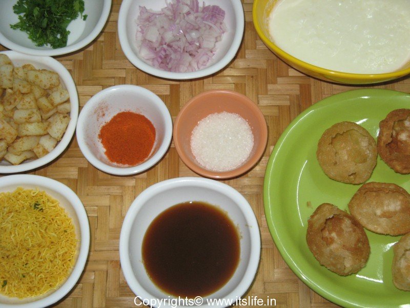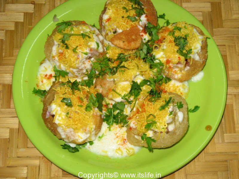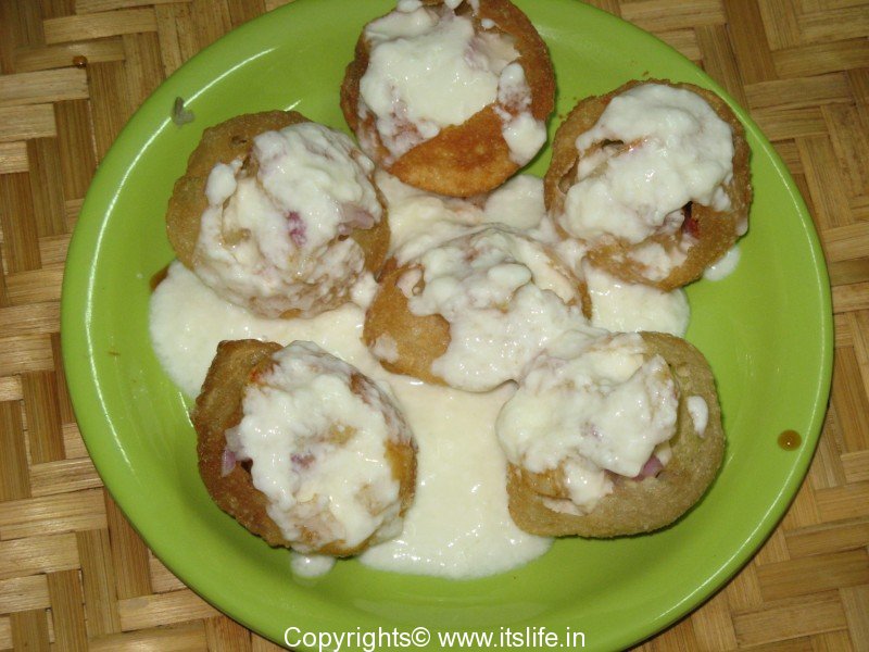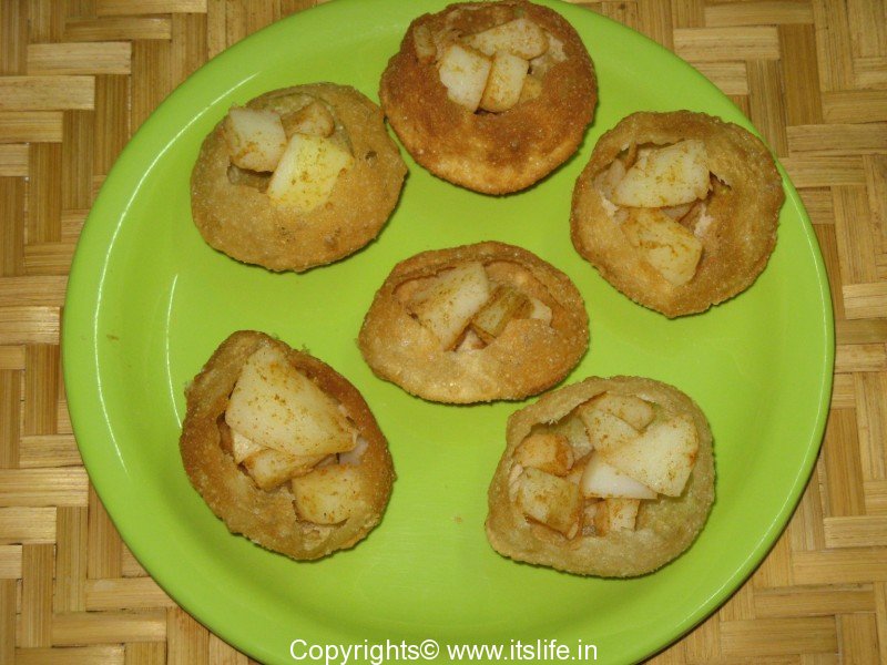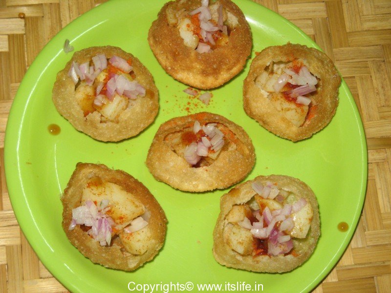 Break the top portion of the Poori for filling. Arrange the Poories in a plate. Fill each one with Aloo. Add little Sweet Chutney over each of the Poori, add Chili powder or Green Chili chutney over the Pooris, add little Onion over each of the Pooris.