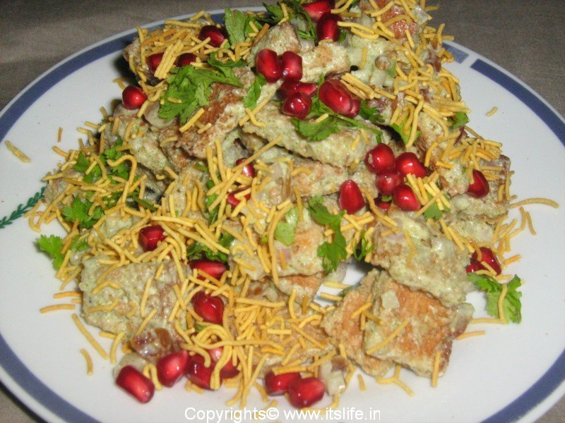 Toast the bread till golden brown and crisp. Mix together Chat Masala, Lime Juice, Mint Chutney, Curds, Sugar, Dates, Onion and Salt in a mixing bowl. Toss the bread cubes in the mixture. Garnish with Coriander, Mint leaves, Pomegranate Seeds and Sev.