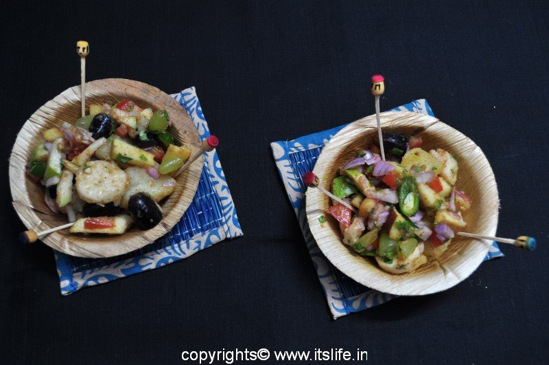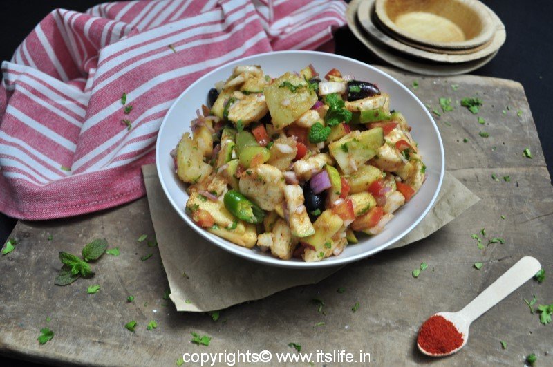 Fruit and Alu Chaat is made with fruits and boiled potatoes tossed in spices. Spice coated potatoes mingled in the juicy sweetness of the fruits is the right treat in the evening after a long and tiring day at work.
