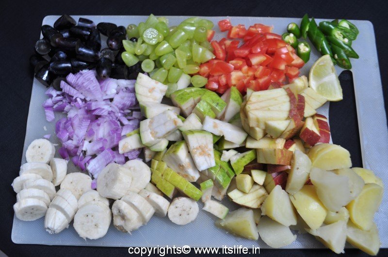 Cut the boiled Potatoes, Apples and Guavas into cubes. Cut the Bananas into thick roundels and the grapes in halves. Cut the tomato into thick chunks. Combine all the Fruits and Potatoes in a big bowl. Add Onions, Tomato chunks and Green Chillies. Sprinkle the spices and the lemon juice. Mix it well with a flat spoon, along with half of the coriander and the mint leaves. Serve Fruit and Alu Chaat garnished with the rest of the Coriander and Mint leaves.