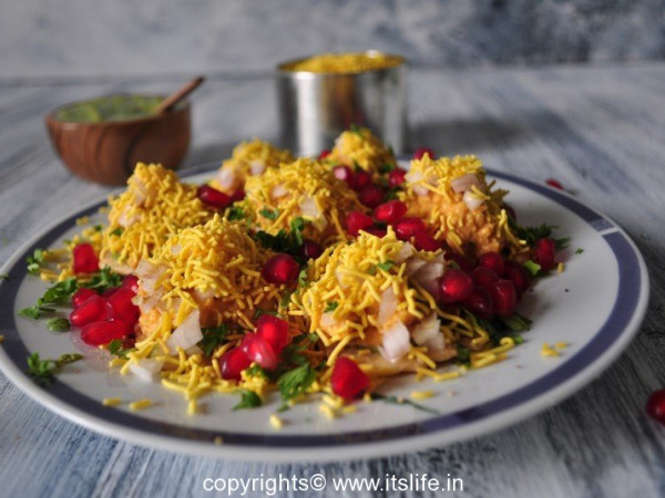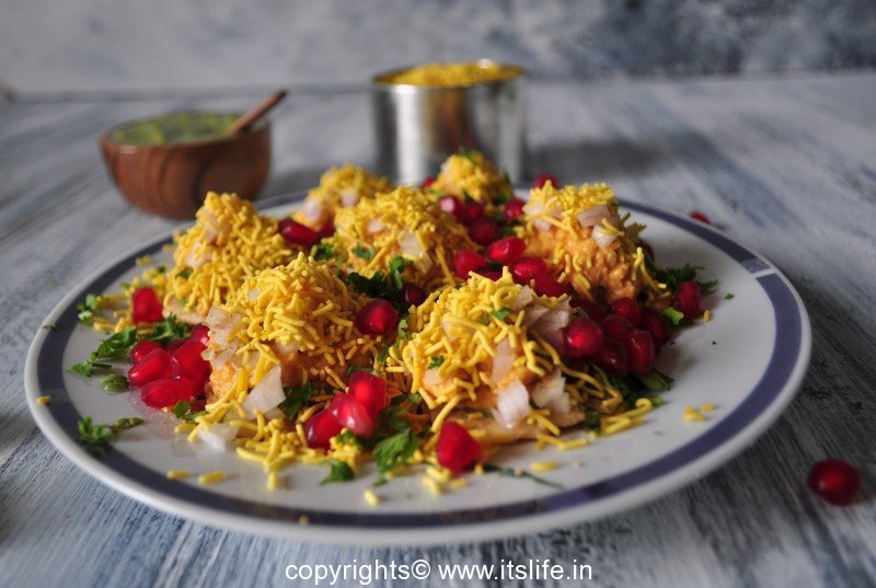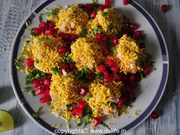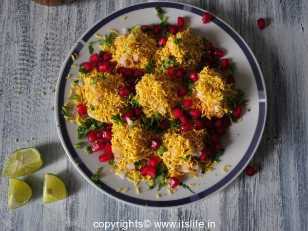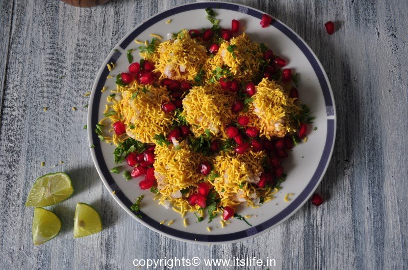 Garnish with sev, pomegranate pearls and coriander leaves.