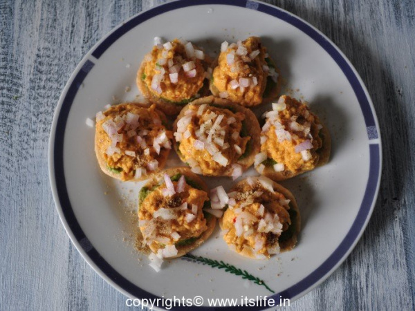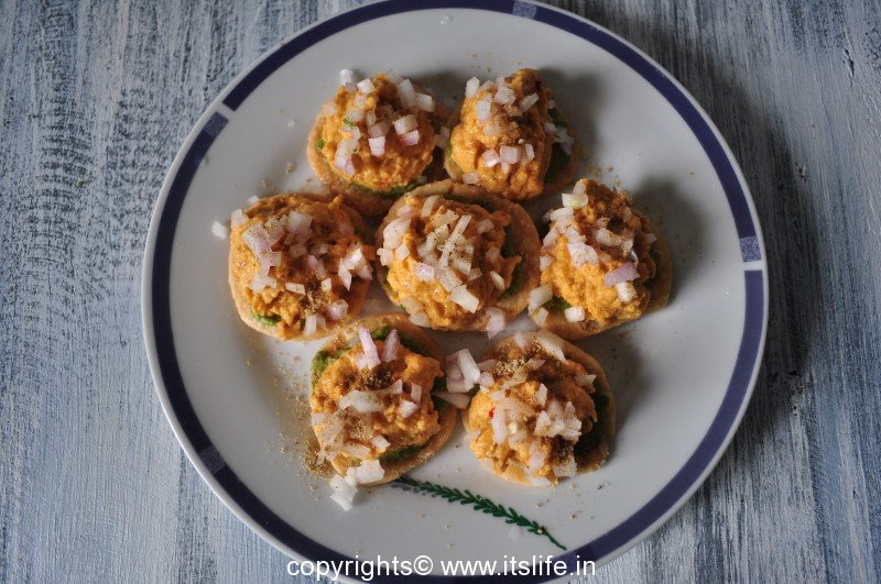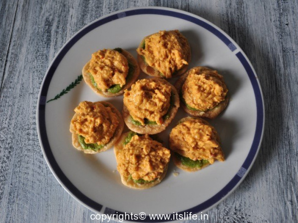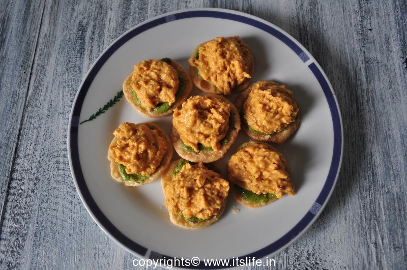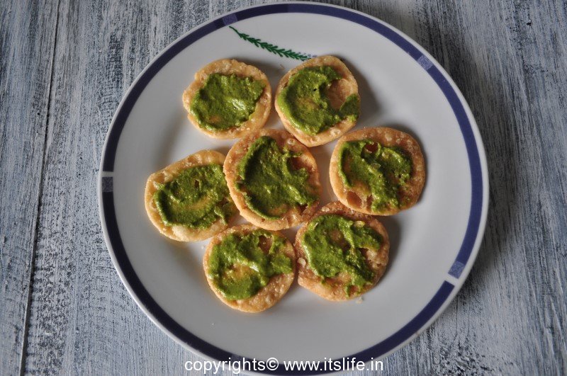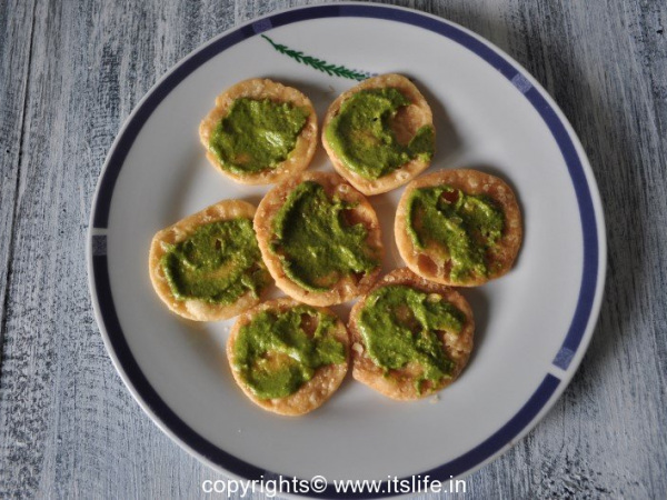 Arrange the Papdis on a serving dish. Spread Green Chutney over each of the Papdi.