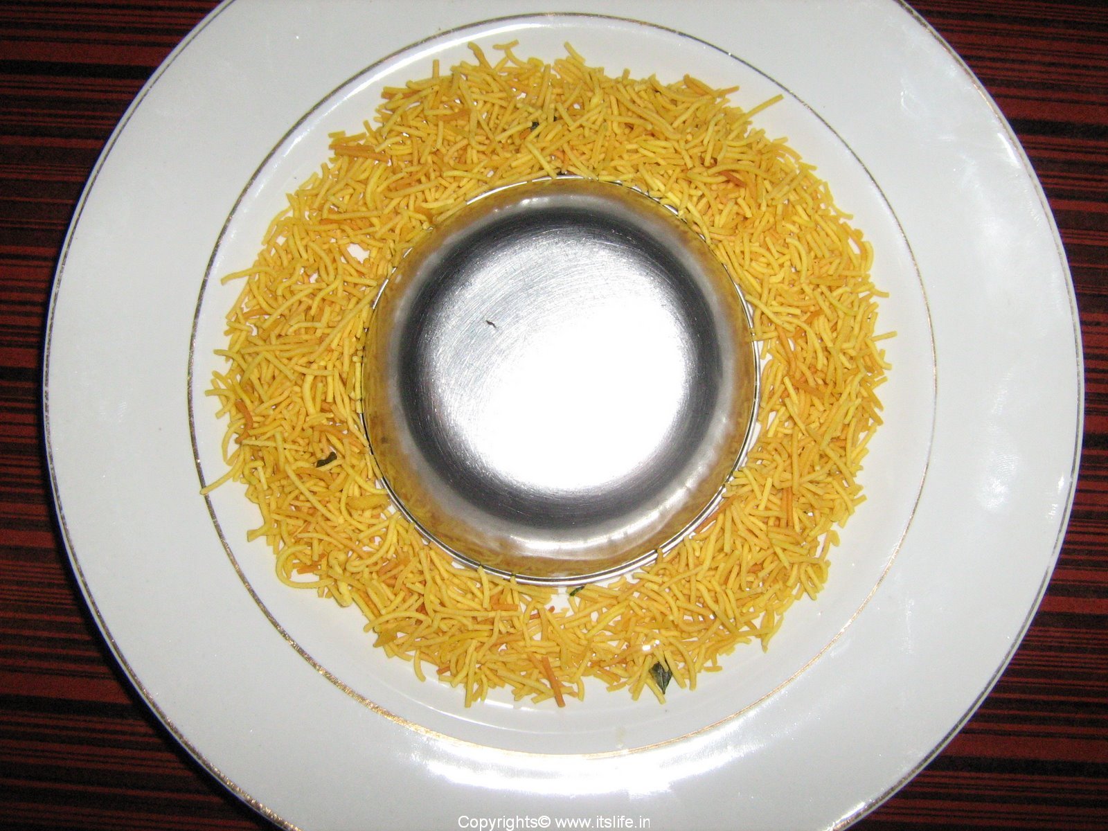 Put the Peas mixture(Misal) in a round Cup, cover with the serving plate and turn it upside down. All around the cup arrange the Papri, Ghathia, Sev and Peanuts, as shown in the picture above (only sev is used in this picture). Slowly remove the katori leaving the Misal on the plate.
