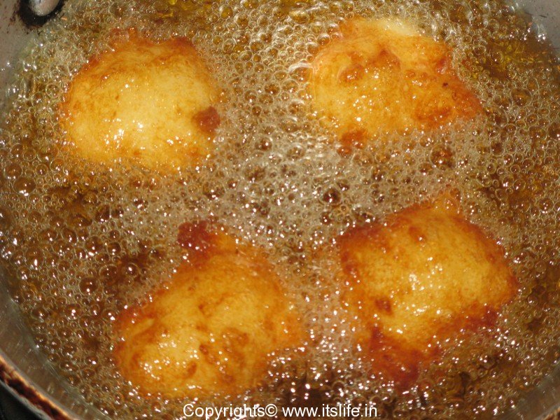 Heat Oil in a frying pan. Take a spoonful of batter in the hand and make a hole in it using the thumb.