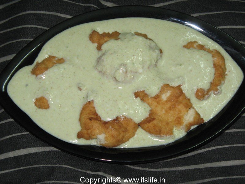 Add the vadas to the Yoghurt mixture and keep it aside for 20 minutes, the vadas will soak in the Yoghurt mixture. Now arrange the Vadas in a tray and pour the remaining Yoghurt mixture over it.