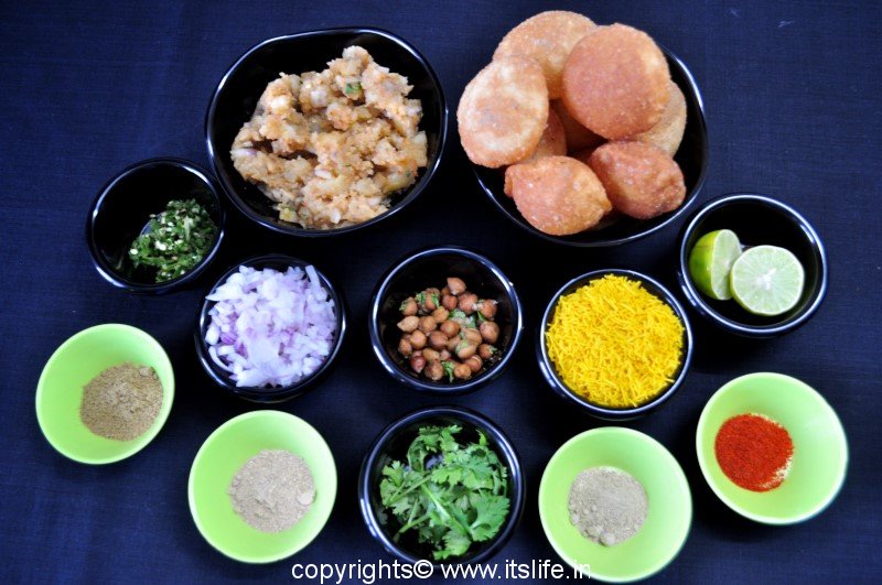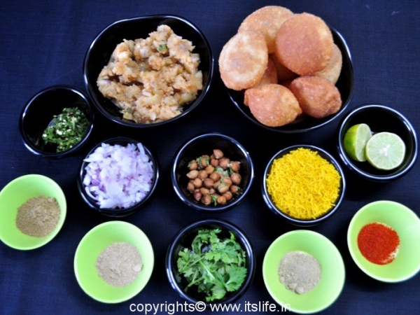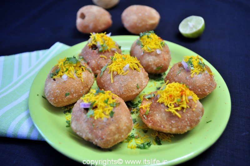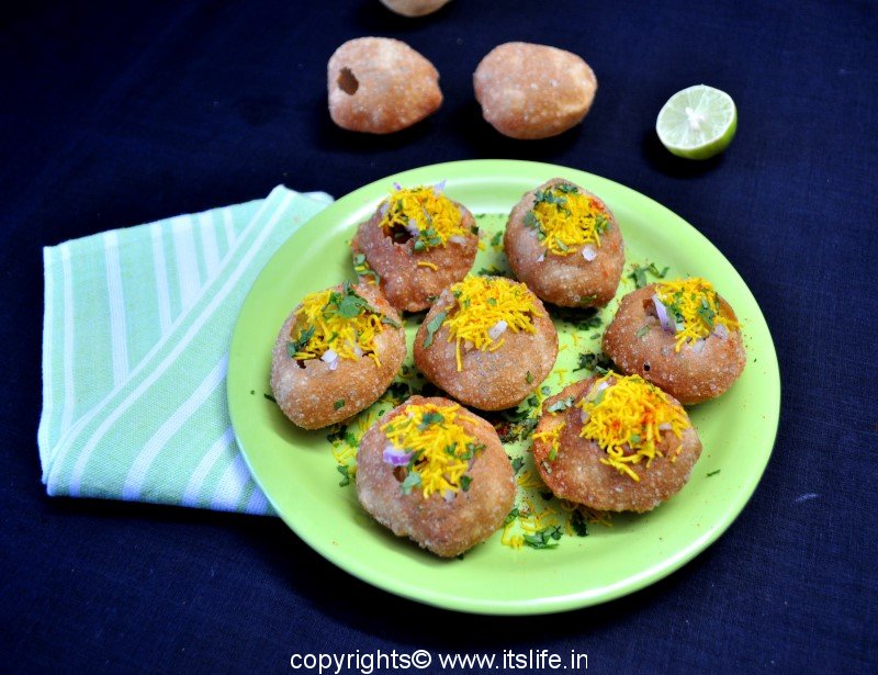 Make a hole in the Puris. Stuff the Puris with Potato. Add few Channa on each of the Puris. Add Onions, Lemon juice, and Coriander leaves. Garnish with Sev.