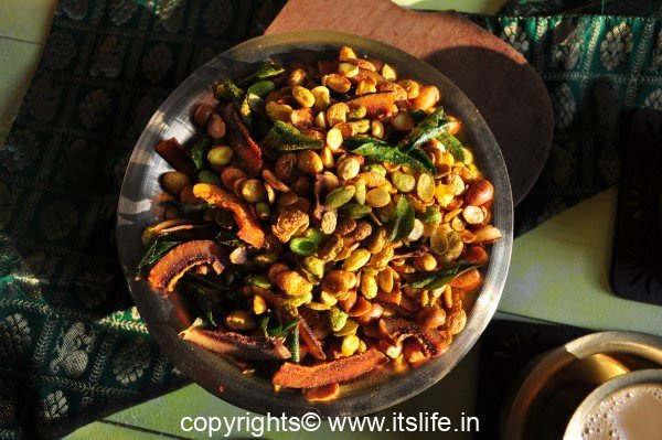 In Bangalore, Mysore region, during Avarekayi season (Nov – Dec – Jan), this mixture would be made in almost all homes and come evening, people would gather after a siesta and play indoor games like Mancala (aluguli mane), pagade (type of ludo), and chowka bara enjoying the mixture with piping hot filter coffee.