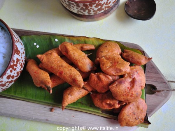 Thin slices of vegetables or slit whole green chilies dipped in spicy batter and deep fried.  A favorite during tea time and this is also served along with Rice and Rasam.