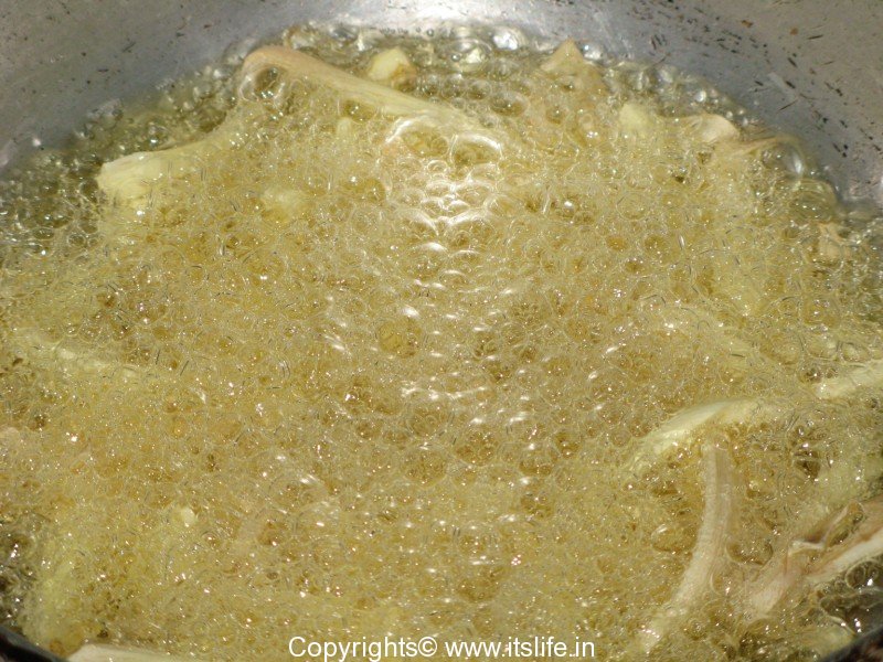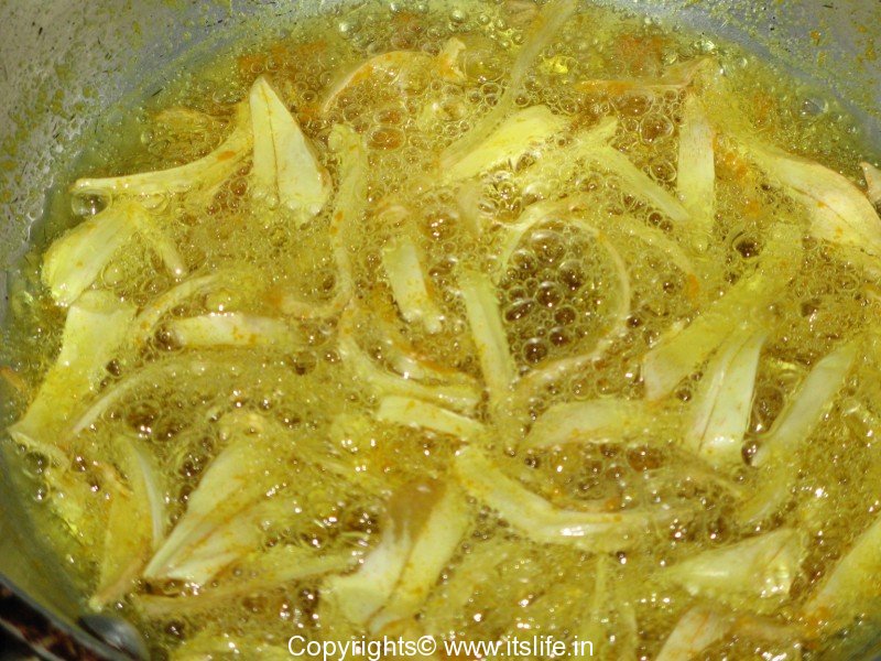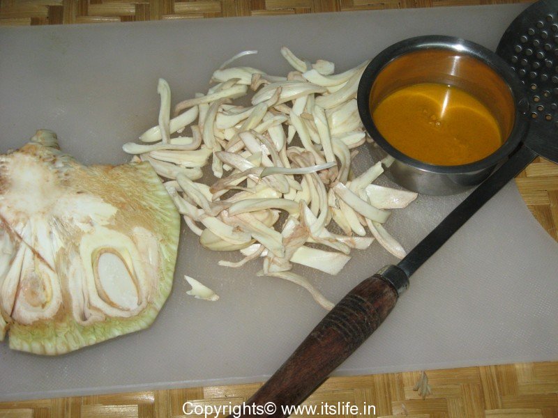 Heat Oil and add the Jackfruit strips. Stir. When the sizzling stops, reduce the heat and add a teaspoon of Turmeric water and close the pan with a lid. Remove the lid after the sizzling stops.