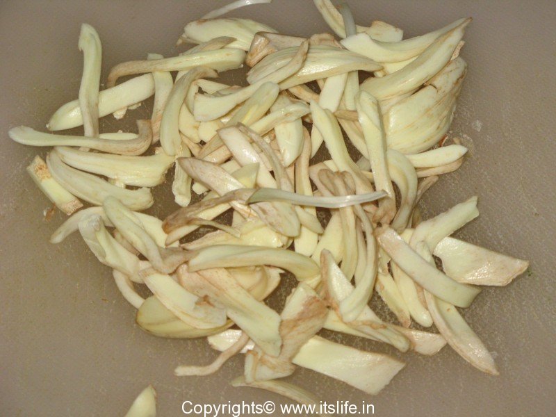 Oil the knife and your hands before cutting the Jackfruit. Remove the middle part and remove the segments outs. Remove the seed and cut into strips.