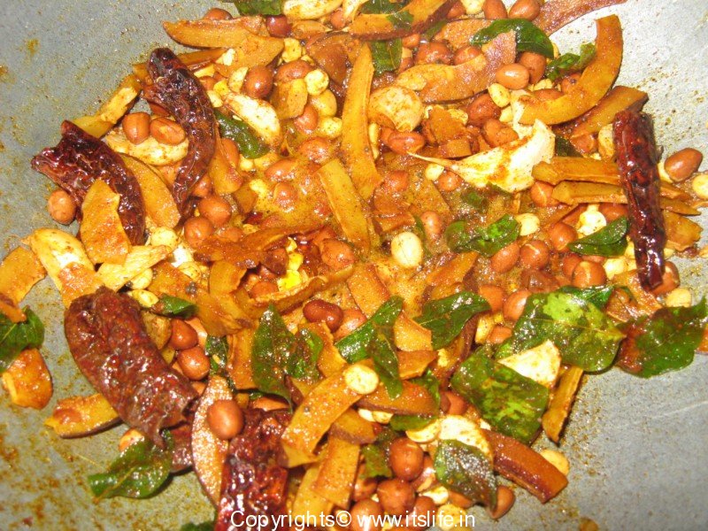 Take Kadalepuri in a big vessel. Heat Oil in a thick bottomed pan and add Mustard seeds and when they splutter add Turmeric powder, Groundnuts and Garlic. Stir for a minute and add Red Chilies, Hurigadale, Coconut, and Curry leaves. After 30 seconds, turn off the stove and add Chili Powder and Salt and mix well. Let it cool.