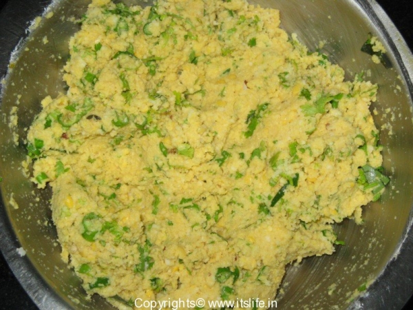 Soak Tur Dal, Moong Dal and Channa Dal for 2 hours. Grind them coarsely and remove to a mixing bowl. Mix all the other ingredients with it.