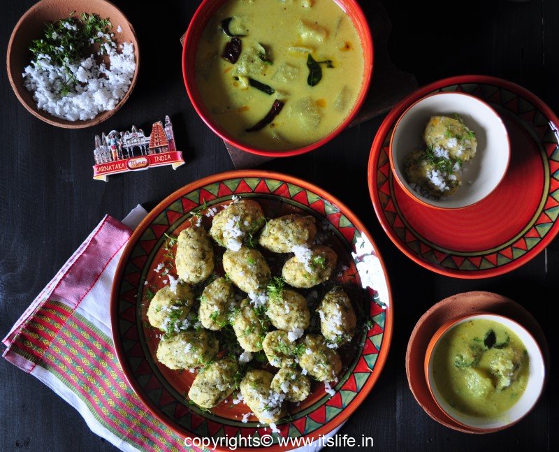Serve Nuchchina Unde with Majjigehuli (curd curry).
