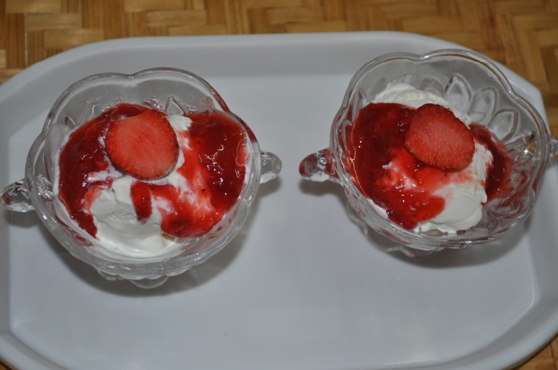Strawberry sauce on Vanilla ice cream is a most sought after dessert.