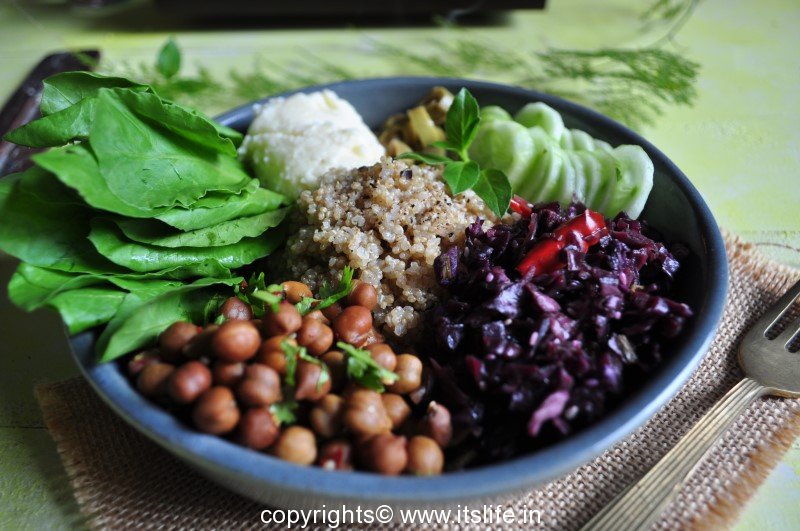 Quinoa Buddha Bowl is a bowl teeming with fibre and protein.  Various tastes and textures form this bowl to satiate the soul.